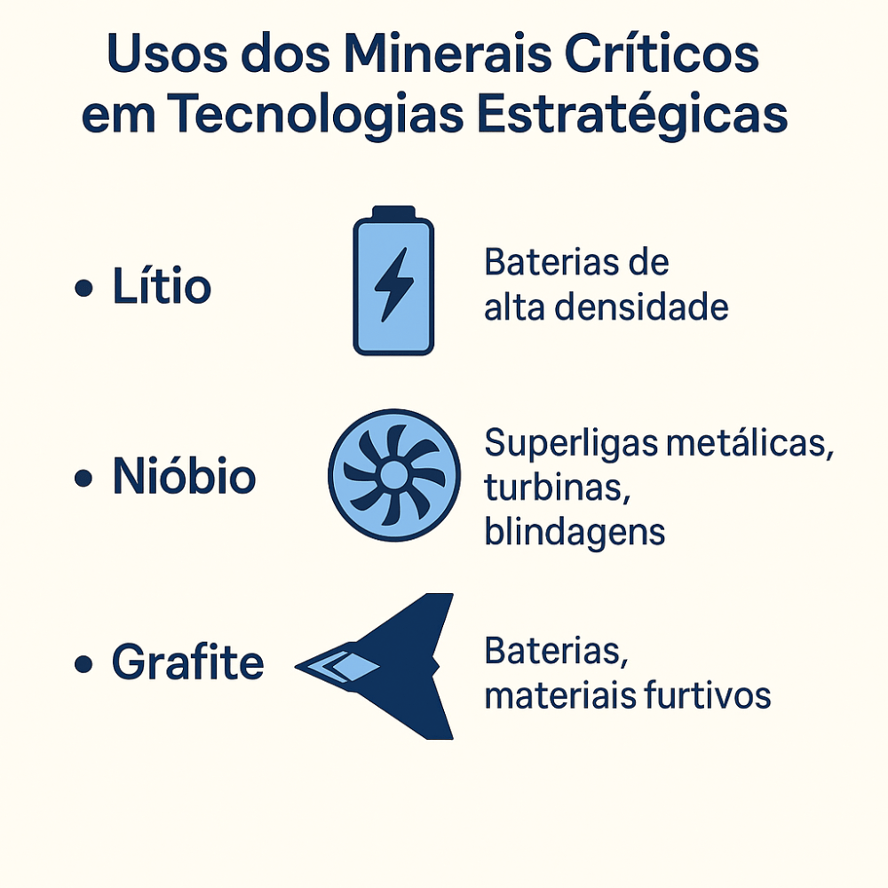 A crescente valorização dos minerais críticos transcende as dimensões econômicas ou energéticas: ela passa a ocupar papel central na arquitetura de soberania e defesa nacional. O lítio, por exemplo, é elemento-chave na produção de baterias de alto desempenho, essenciais para veículos elétricos e sistemas de armas autônomos. O nióbio é estratégico para ligas metálicas de alta resistência, usadas em blindagens, turbinas e componentes aeroespaciais. Já o grafite é fundamental em processos de armazenamento de energia e tecnologias furtivas. Nesse cenário, garantir o domínio e o aproveitamento eficiente dessas reservas representa não apenas uma oportunidade econômica, mas uma necessidade geopolítica.